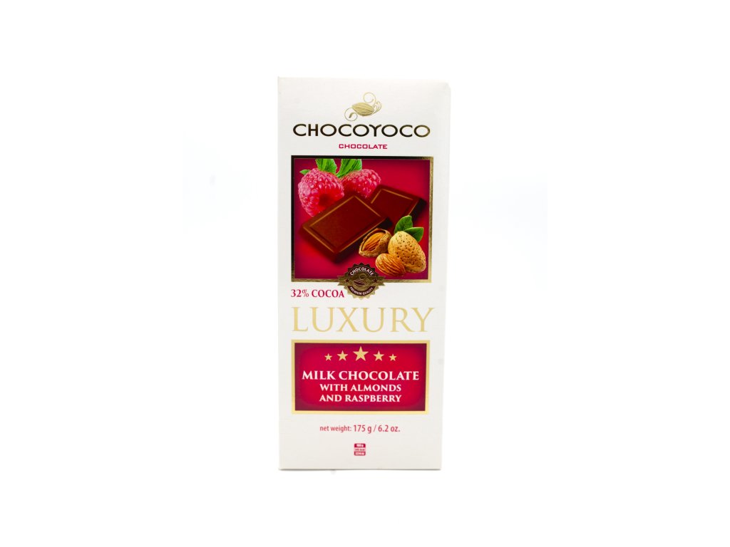 Zloženie: krájané mandle 6%, mrazom sušené jahody 1,5%, kakaové maslo, cukor, kakaová hmota, emulgátor sójový lecitín, sušené mlieko, sušená srvátka, aróma. Obsah kakaovej sušiny najmenej 32%. Mliečna sušina najmenej 14%. Môže obsahovať arašidy, iné orechy, obilniny obsahujúce lepok(glutén).