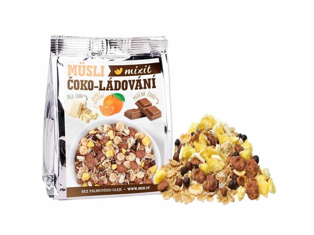 kukuričné lupienky v mliečnej čokoláde 35 % (mliečna čokoláda 56 % (cukor, kakaové maslo, sušené plnotučné mlieko, kakaová hmota, emulgátor: lecitín; prírodná vanilková aróma), kukuričné lupienky 42 % (kukuričná krupica, cukor, jedlá soľ, jačmenný sladový výtažok, farbivo: uhličitany vápenaté), leštiaca látka: arabská guma; cukor, med), ovsené lupienky, zmes čokoládových chrumiek 14 % (horká čokoláda 35 % (cukor, kakaová hmota, kakaové maslo, emulgátor: lecitíny; prírodná vanilková aróma), mliečna čokoláda 35 % (cukor, kakaové maslo, sušené plnotučné mlieko, kakaová hmota, emulgátor: lecitíny; prírodná vanilková aróma), pšeničný extrudát 28 % (pšeničná múka, pšeničná krupica, cukor, jedlá soľ, kakaový prášok so zníženým obsahom tuku) leštiaca látka: arabská guma; cukor, med), pšeničné lupienky, kukuričné lupienky v bielej čokoláde 11 % (biela čokoláda 56 % (cukor, kakaové maslo, sušené plnotučné mlieko, sušená smotana, emulgátor: lecitíny; prírodná vanilková aróma), kukuričné lupienky 42 % (kukuričná krupica, cukor, jedlá soľ, jačmenný sladový výtažok, farbivo: uhličitany vápenaté), leštiaca látka: arabská guma; cukor, med), čokoládové hobliny biele 5 % (cukor, sušené plnotučné mlieko, kakaové maslo 23,5 %, emulgátor: sójový lecitín; prírodná vanilková aróma), lyofilizovaný pomaranč.