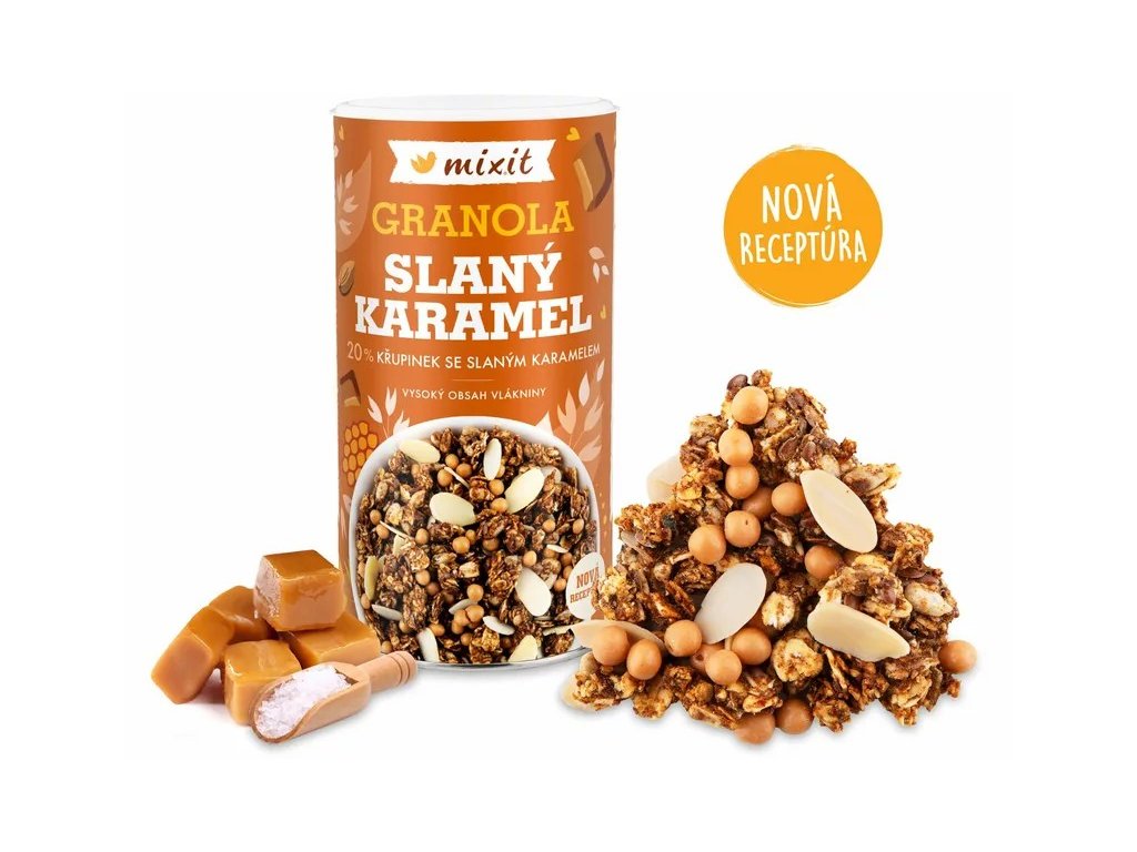 medová granola z pece 67 % (ovsené vločky, ľanové semená, slnečnicové semená, sušené datle, med, prepustené maslo bez laktózy), chrumky so slaným karamelom 20 % (biela čokoláda s karamelom 70 % (cukor, kakaové maslo, sušené mlieko, karamelový prášok s mliečnym tukom (sušené mlieko, sušená srvátka, cukor, mliečny tuk, prírodná vanilková aróma), karamelizovaný cukor, kakaová hmota, emulgátor: lecitíny; jedlá soľ 0,52 %), pšeničné guľôčky 28 % (pšeničná múka 79,4 %, cukor 19,9 %, kakao so zníženým obsahom tuku 0,2 %, jedlá soľ 0,5 %), jedlá soľ 1 %, leštiaca látka: arabská guma; cukor, med), plátky mandlí 13 %