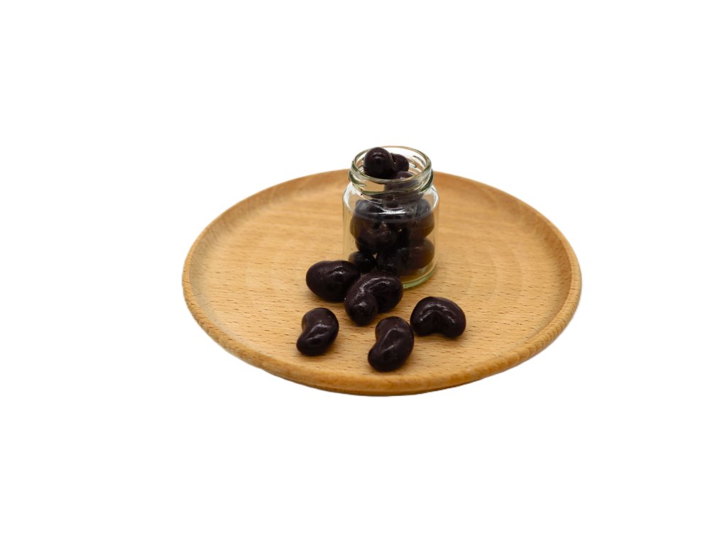 Zloženie: horká čokoláda 74%( kakaové maslo, cukor, kakaová hmota, emulgátor sójový lecitín, sušené mlieko, prírodná vanilková aróma), kešu orechy pražené 25%, povlaková látka( sukralóza, glukózový sirup, olej kokosový a palmový, arabská guma, šelak, etanol, regulátor kyslosti kyselina citrónová, konzervačná látka E200). Obsah kakaovej sušiny najmenej 50%.