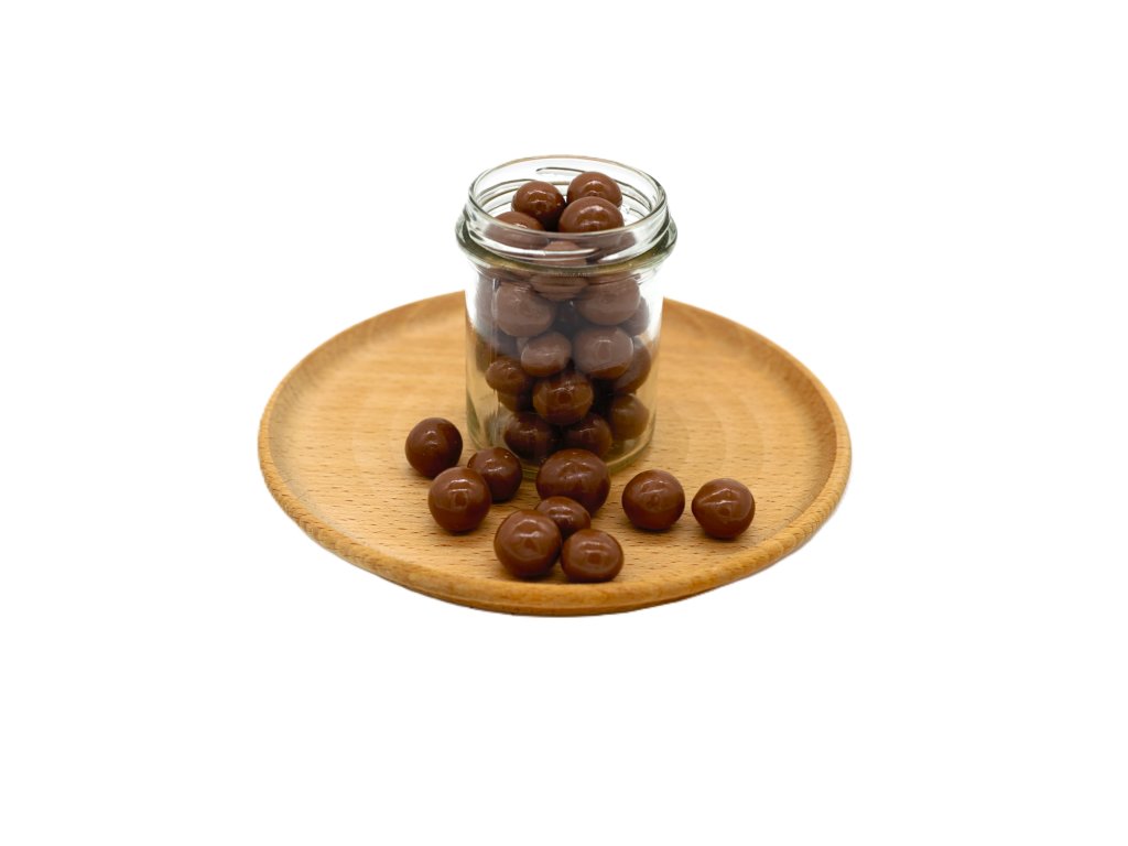 Lieskový oriešok obalený v mliečnej čokoláde, krásne lesklý ako leštený drahokam-