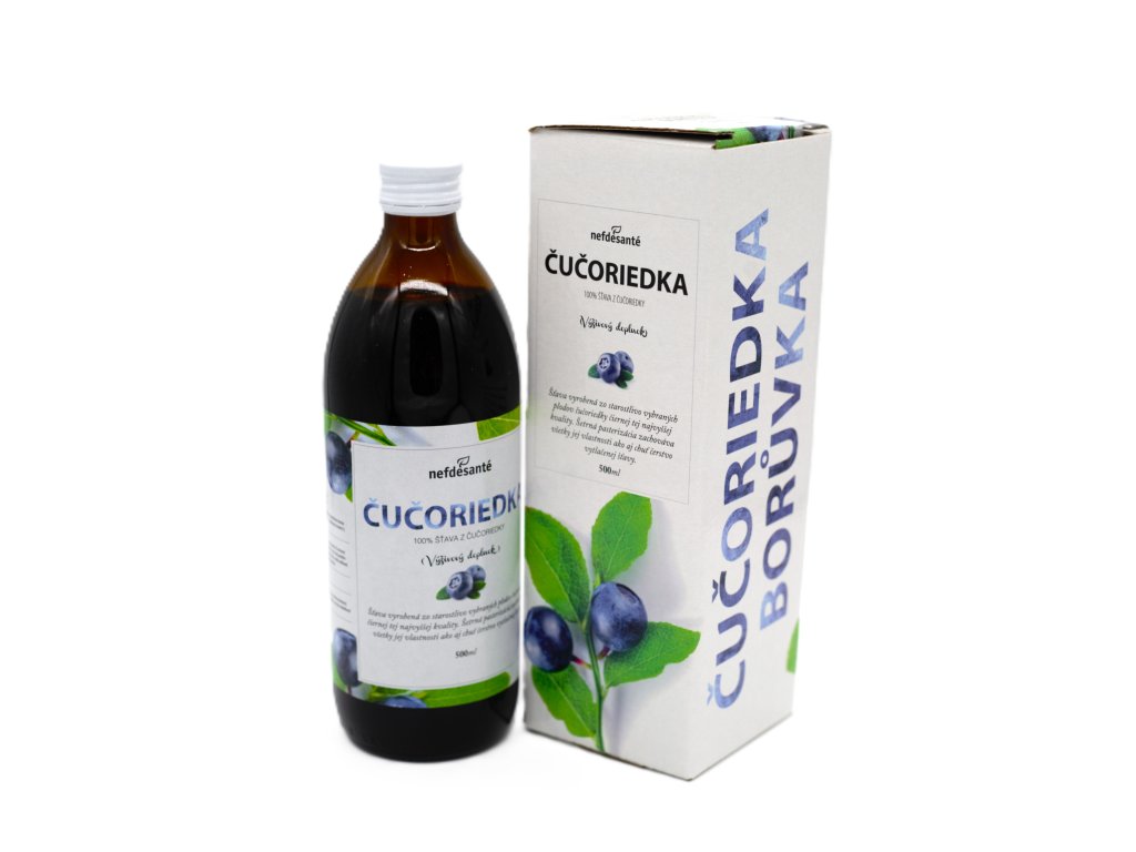 Zloženie: Zloženie a charakteristické látky s výživovým a/alebo fyziologickým účinkom na odporúčanú dennú dávku 50 ml: šťava z plodov Čučoriedky čiernej (Vaccinium myrtillus L.), kyselina L-askorbová (vitamín C) 120 mg, t.j. 150% NRV*. (*NRV = referenčná výživová hodnota).