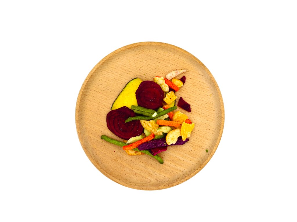 Zloženie: zelená reďkovka 18 %, mrkva 17 %, slnečnicový olej 15 %, batáty 12 %, tekvica 10 %, červená repa 8 %, fialové zemiaky 7 %, taro 5 %, sladový cukor 4 %, zelené fazuľky 1 %, soľ 1 %